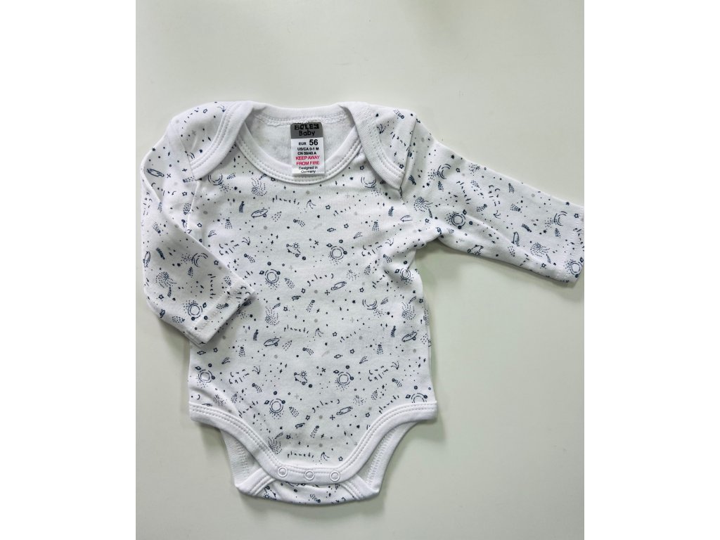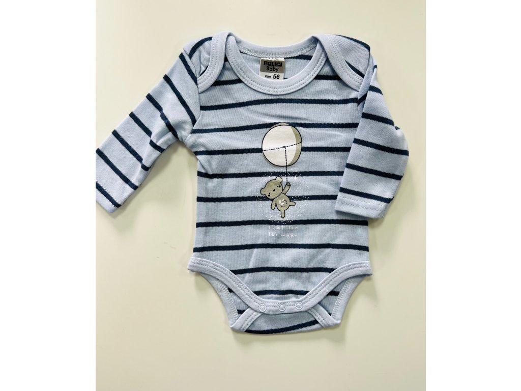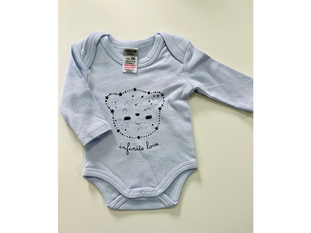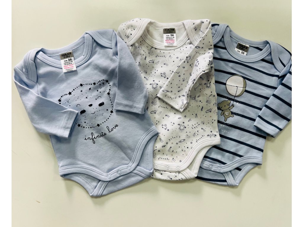 Klasická body s dlouhým rukávem, světle modré barvy. V packu jsou 3 kusy. Modré s pruhy, světle modré a bílé s potiskem.