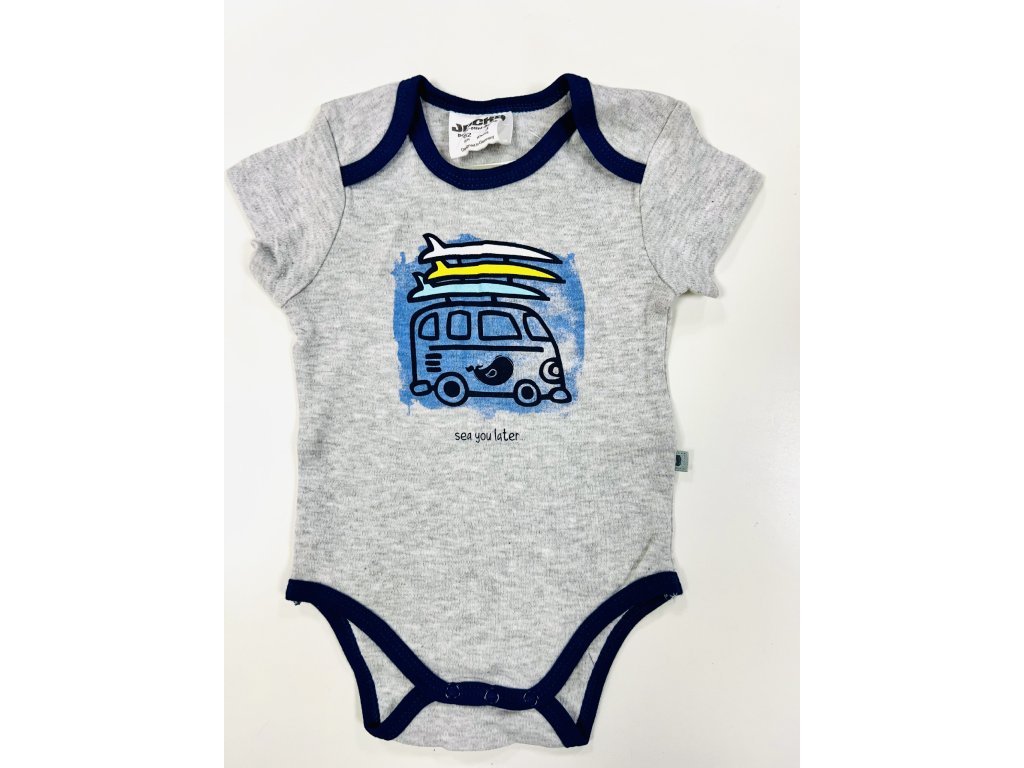 Výhodný set body s krátkým rukávem, prodávaný po 2 kusech. Barvy šedá a bílá, potisk motiv dovolená, moře, auto se surfy, velryba. Oblékání přes hlavu, patentky na rameni a v mezinoží .