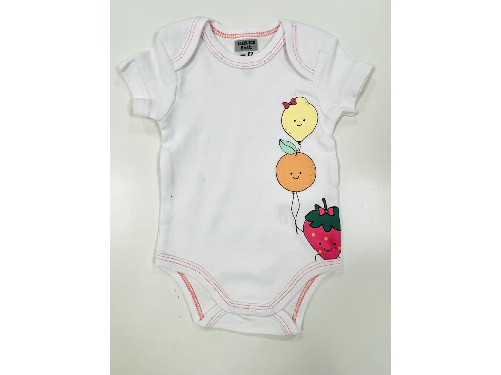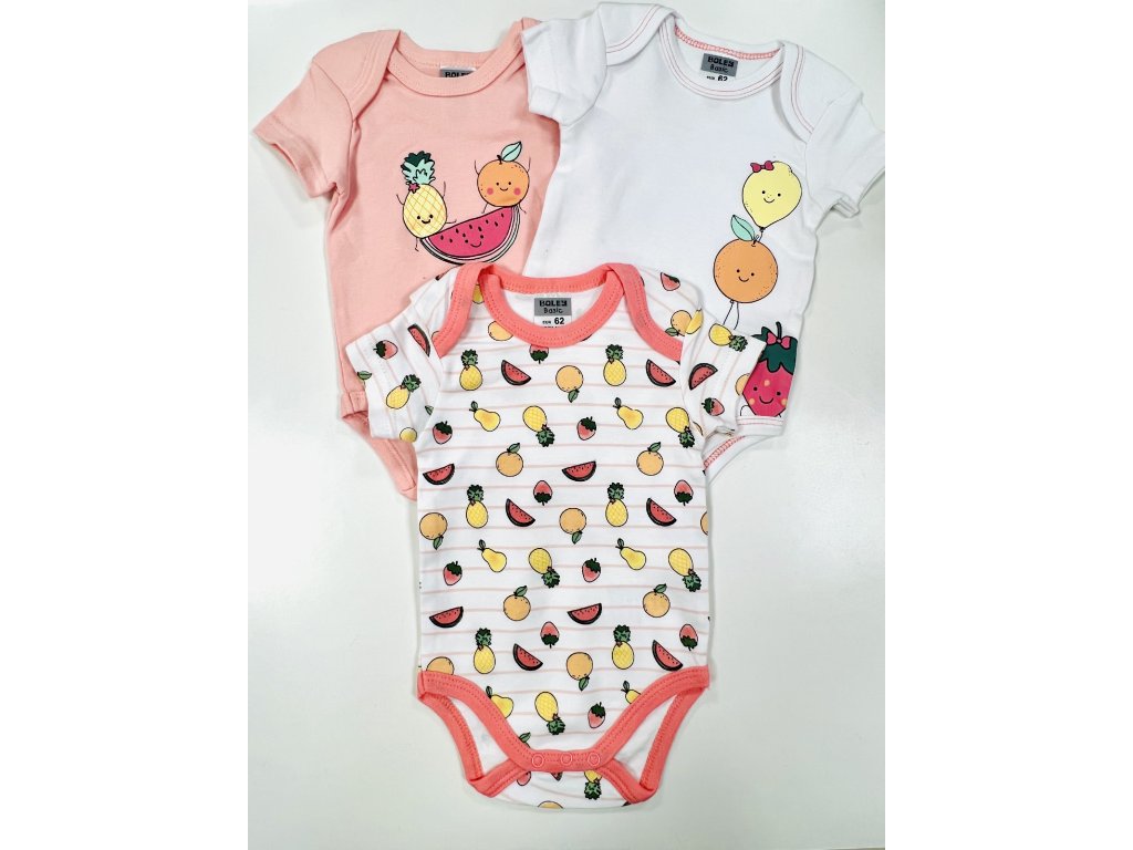 Body s krátkým rukávem, balení obsahuje 3 kusy, velmi výhodná cena. Příjemné bavlněné body, obrázky ovoce.