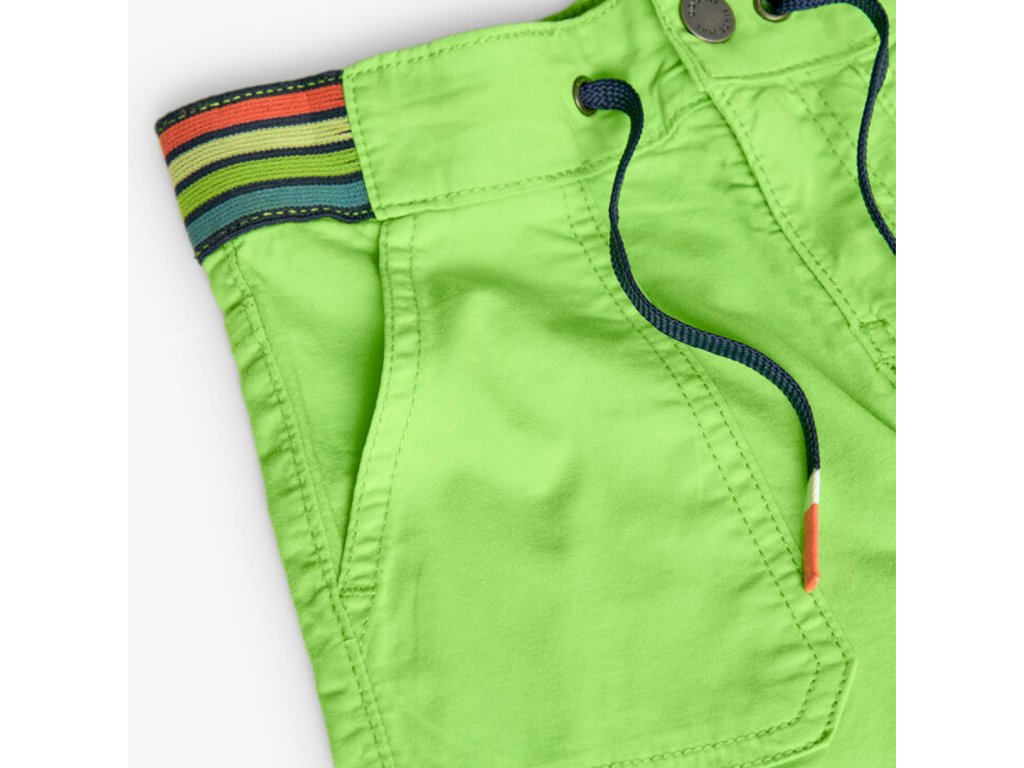 Kraťasy výrazné zelené barvy, zapínání na knoflík a zip. Vpředu dvě velké kapsy, vzadu dvě kapsy. V pase na tkaničky, která slouží ke stažení pasu. Ohrnuté nohavice. Pruží. Doporučujeme kombinovat s tričky z nabídky, vytvoříte tak neodolatelný letní outfit.