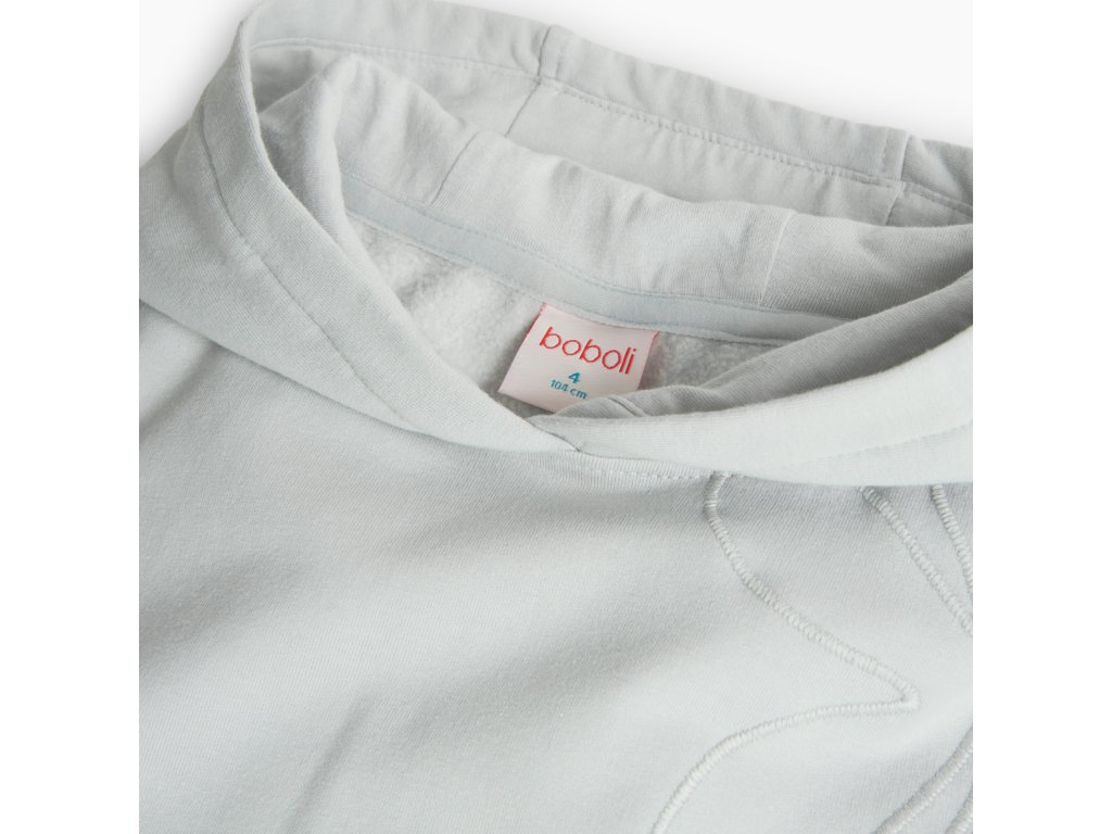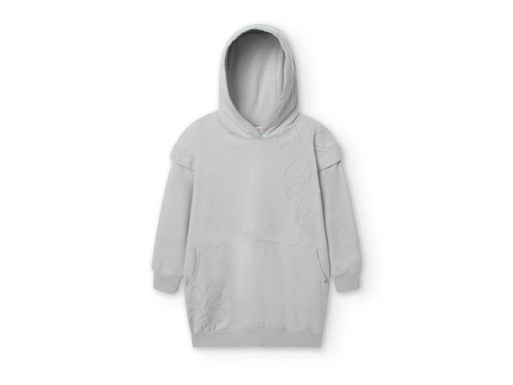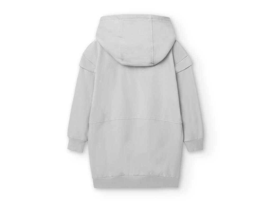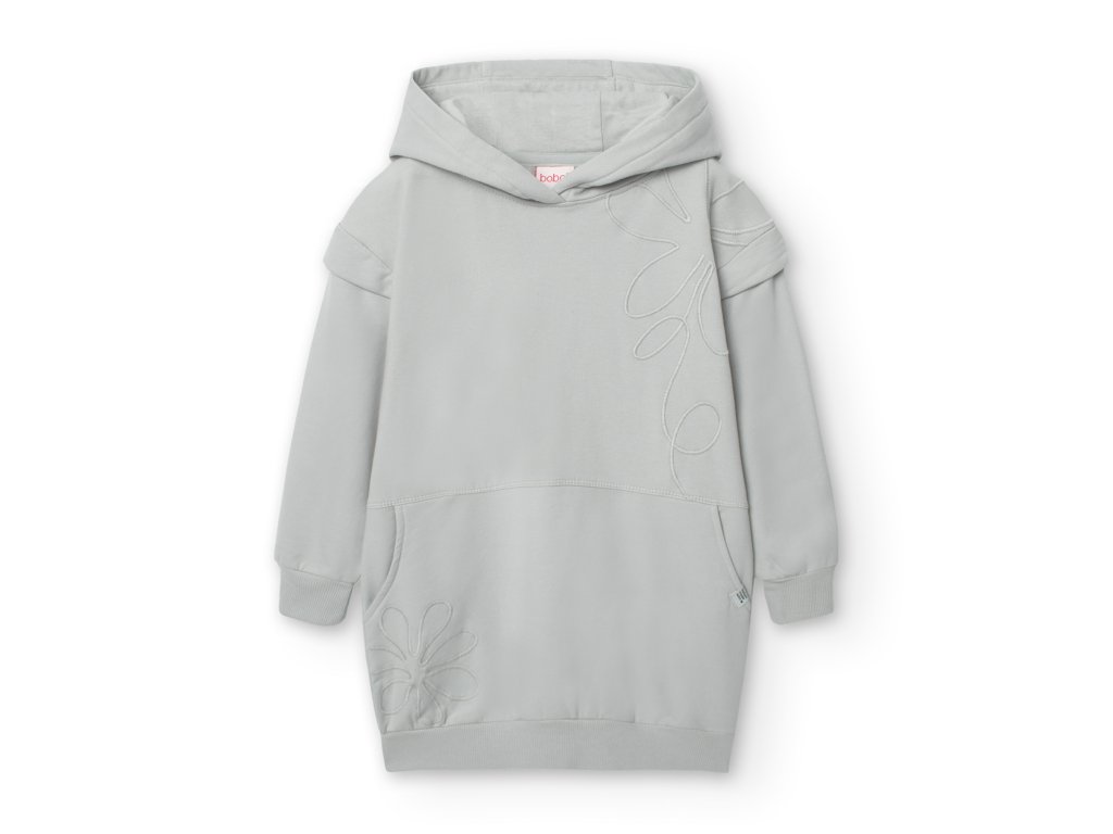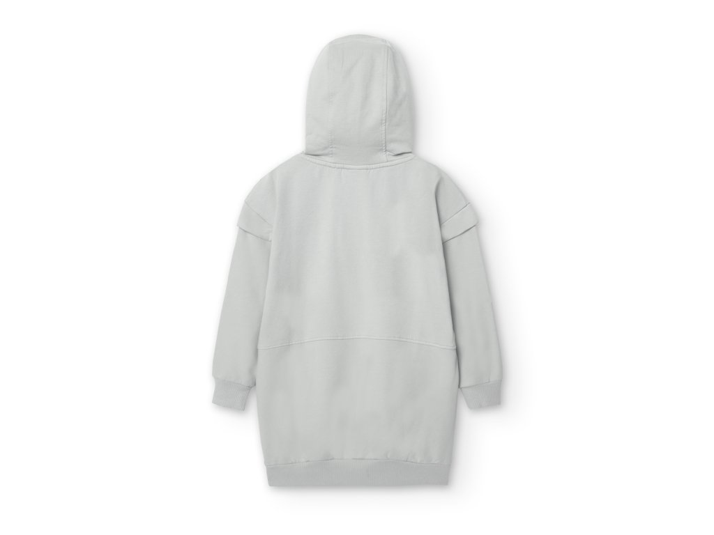 Mikinové šaty s kapucí, světle šedá barva. Vpředu dvě kapsy. Spodní lem a rukávy mají náplet. Skvělé a pohodlné šaty vhodné pro každodenní nošení. Uvnitř jemný flees.