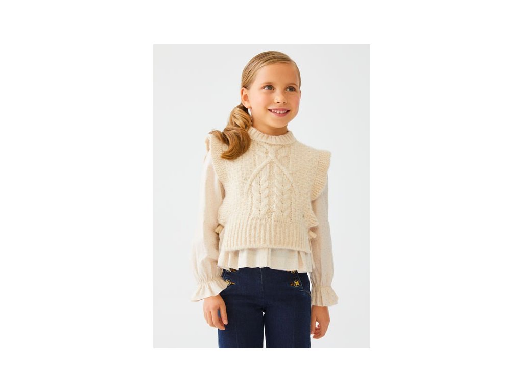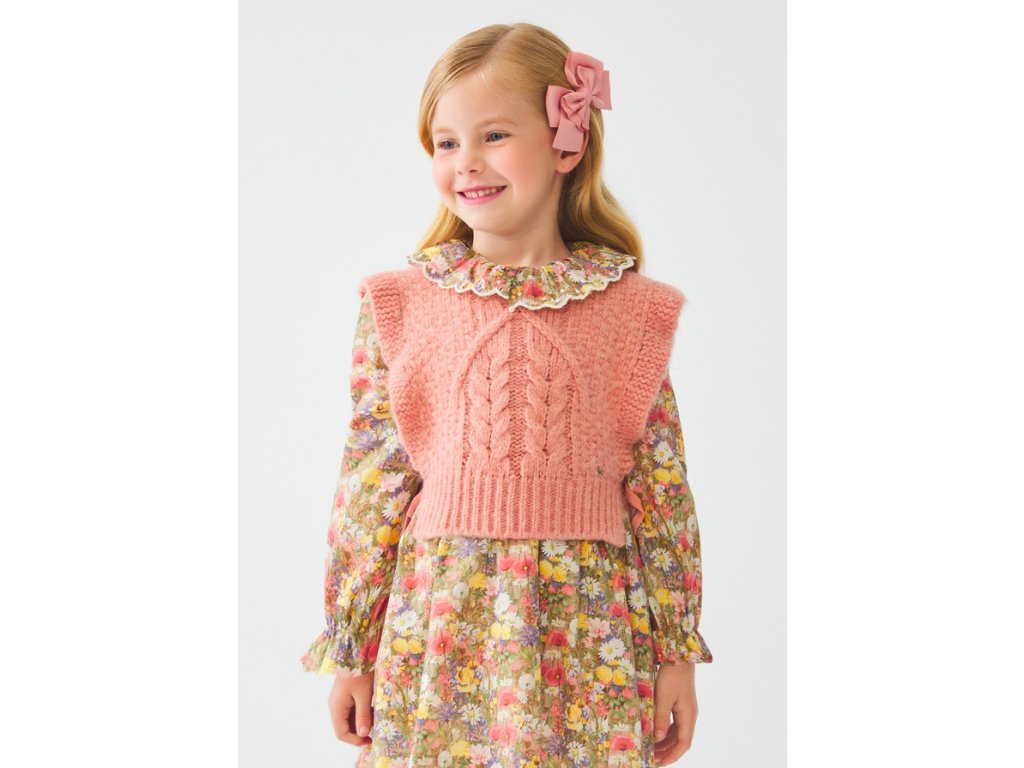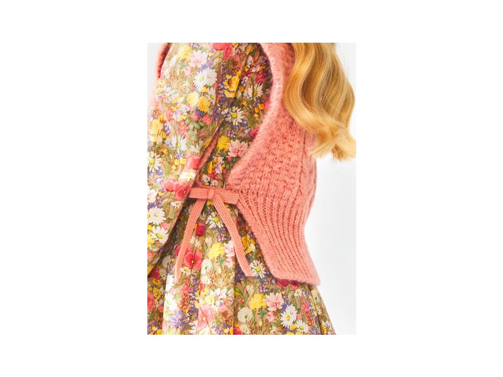 Módní vesta z vlny, hřejivá, se vzorem, u pasu zavazování na tkaničky. Zadní díl delší , krásné pokryje záda. Barva starorůžová. Skladem i v smetanové barvě.