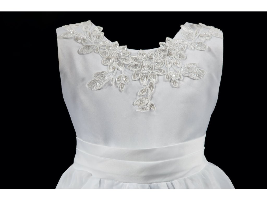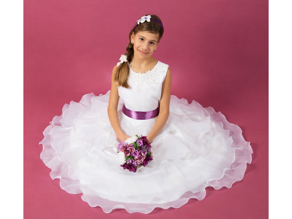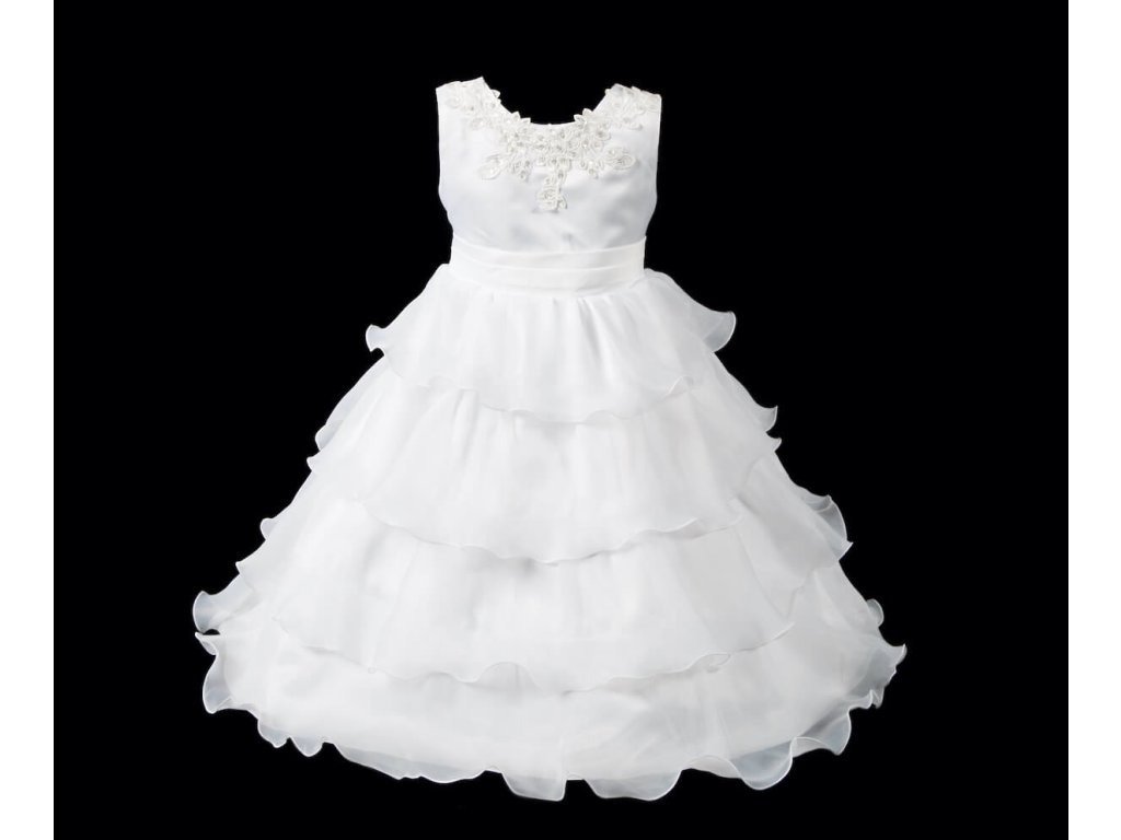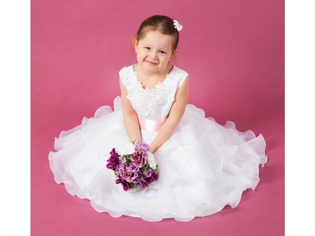 Luxusní bílé šaty s kaskádovitě skládanými volánky, jsou určeny pro družičky, ale i na svaté přijímání a jiné společenské události. Mají nylonovou spodničku, kruhovou obruč (je vyjmutelná), která dodává šatům na objemu. Vrchní část šatiček je zdobena jemnou vyšívanou krajkou se zdobnými korálky s flitry. Šaty mají široká ramínka, zapínání vzadu na zip. V pase je bílá stuha, kterou tak upravíte pas dle potřeby. Velikost odpovídá věku. Doporučujeme: Šaty po rozbalení vyvěste a ručně vytvarujte kovovou obruč u sukně, důsledkem přepravy může dojít ke zkroucení. Kombinujte barevné stuhy v pase s doplňky nevěsty, květinami. Vylaďte tak šaty do Vašich svatebních barev.
