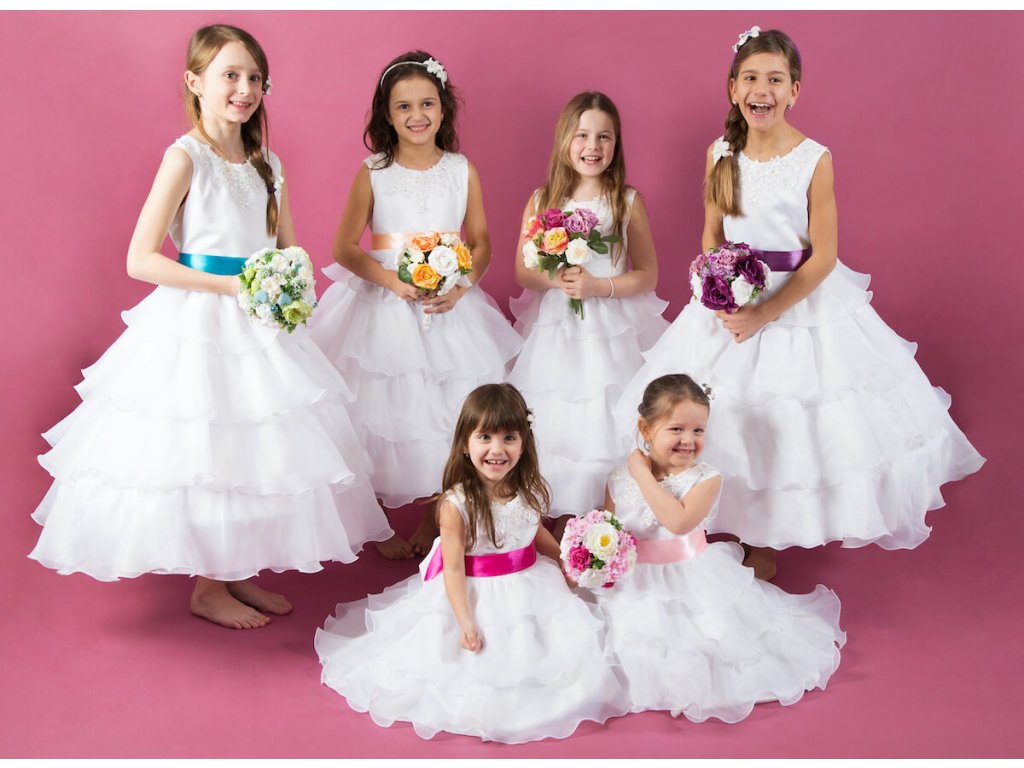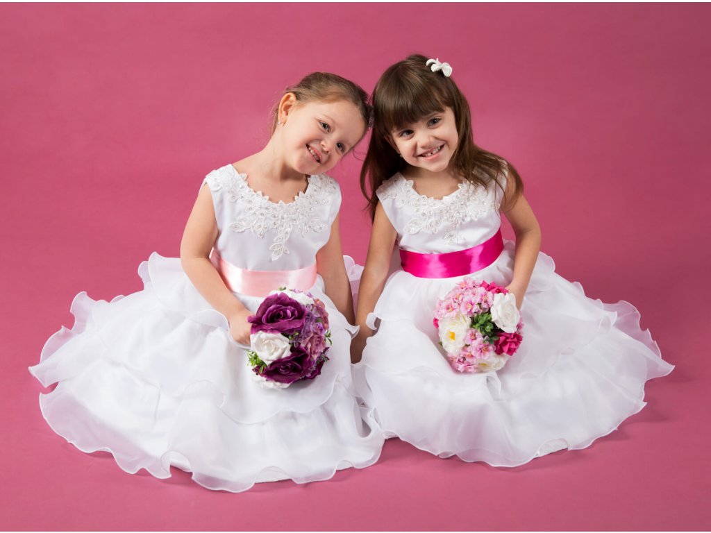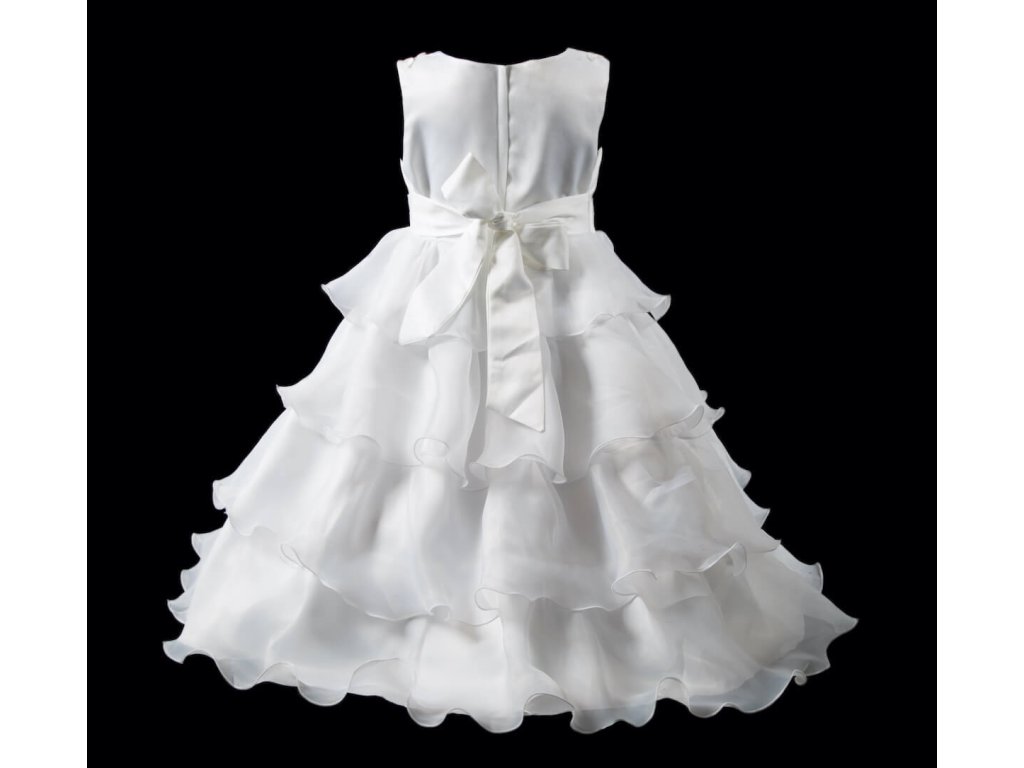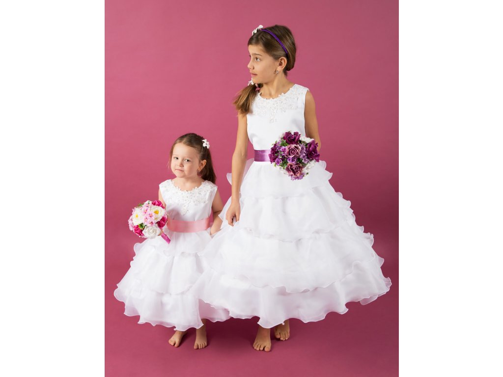 Luxusní bílé šaty s kaskádovitě skládanými volánky, jsou určeny pro družičky, ale i na svaté přijímání a jiné společenské události. Mají nylonovou spodničku, kruhovou obruč (je vyjmutelná), která dodává šatům na objemu. Vrchní část šatiček je zdobena jemnou vyšívanou krajkou se zdobnými korálky s flitry. Šaty mají široká ramínka, zapínání vzadu na zip. V pase je bílá stuha, kterou tak upravíte pas dle potřeby. Velikost odpovídá věku. Doporučujeme: Šaty po rozbalení vyvěste a ručně vytvarujte kovovou obruč u sukně, důsledkem přepravy může dojít ke zkroucení. Kombinujte barevné stuhy v pase s doplňky nevěsty, květinami. Vylaďte tak šaty do Vašich svatebních barev.