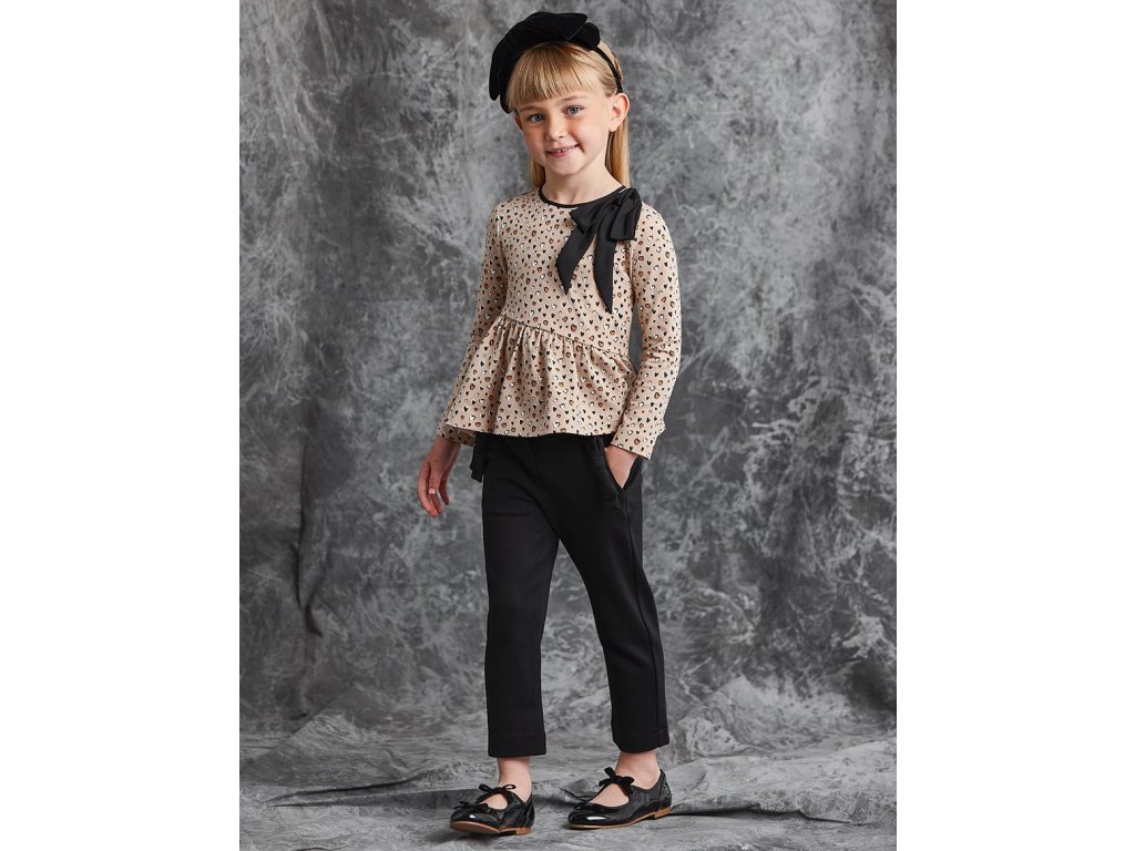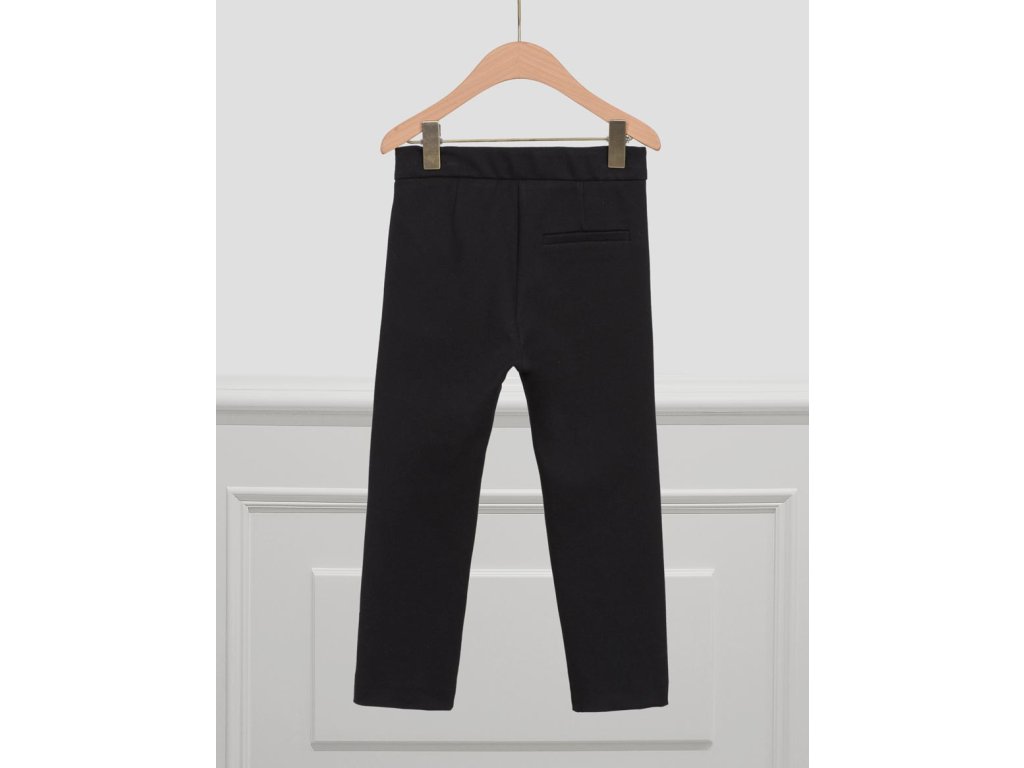 Luxusní společenské kalhoty černé barvy. Vpředu ozdobné mašličky, vzadu kapsička. Nastavitelný pas. Obsahují velký podíl viskózy, jsou velmi příjemné a pohodlné. Doporučujeme kombinaci s bílým svetříkem, vhodné do divadla, společnosti.