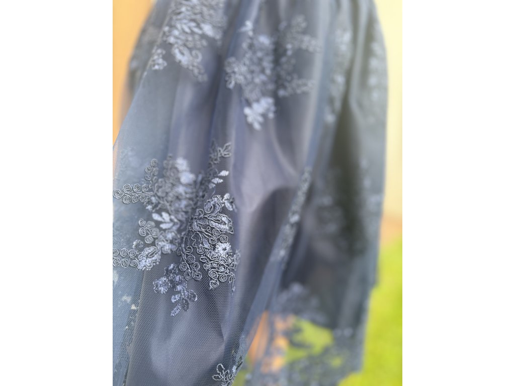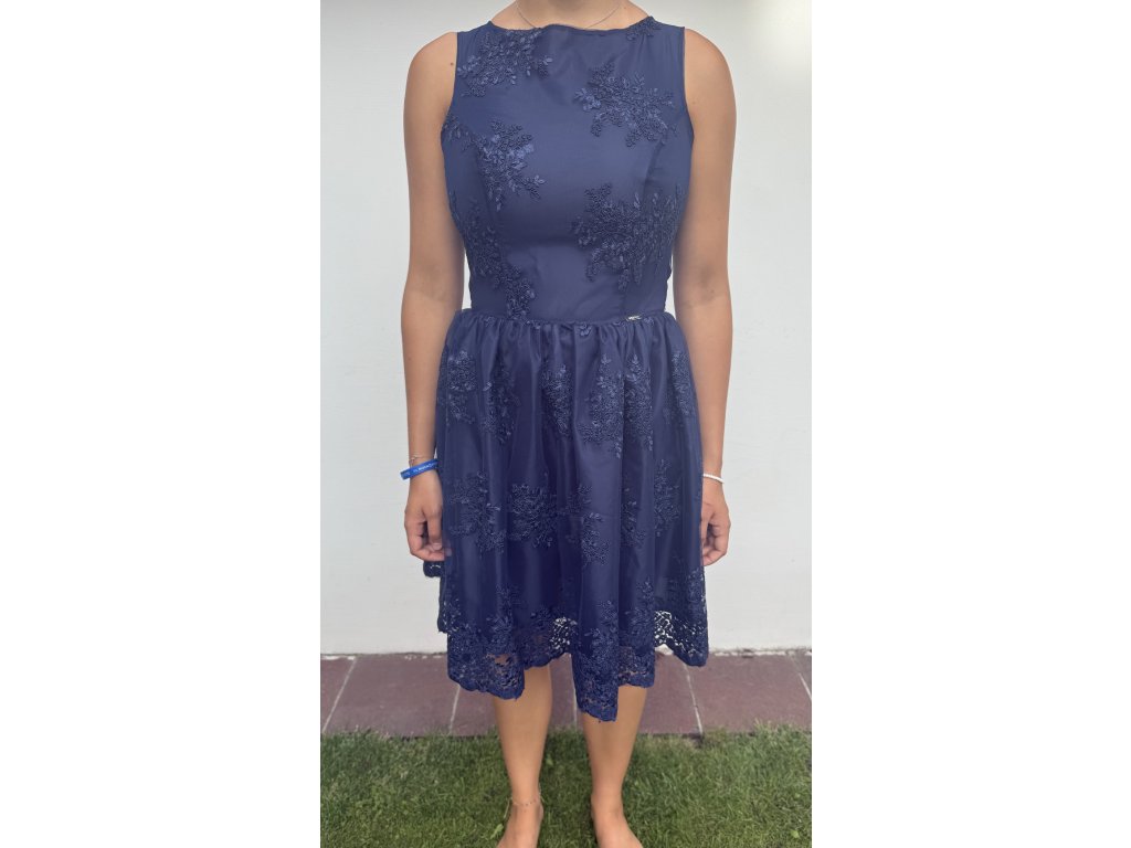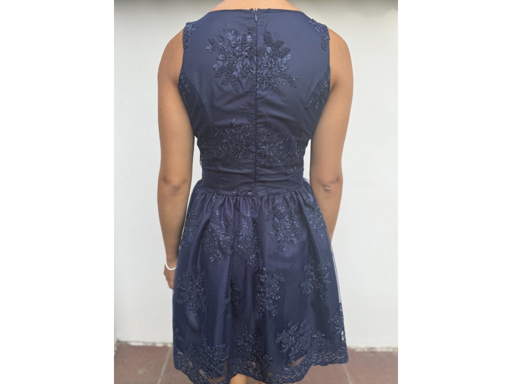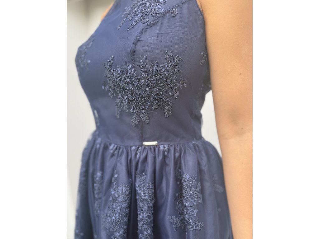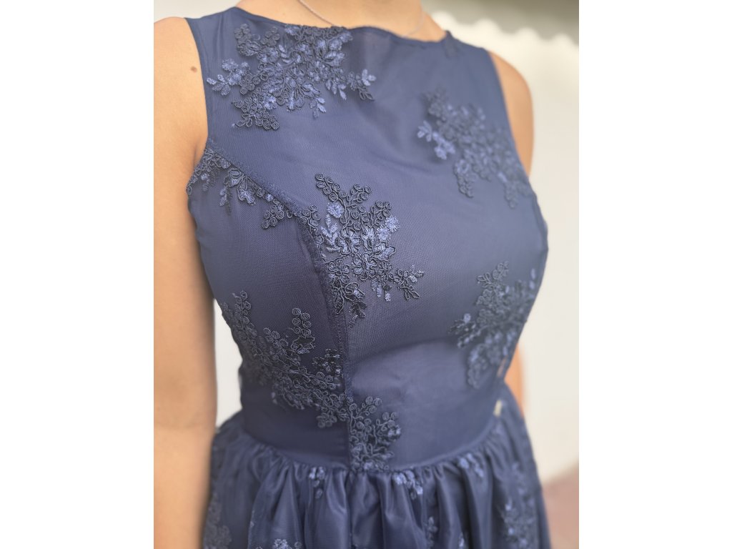 Společenské šaty vhodné do tanečních, divadla, na společenské akce. Šaty jsou bez rukávu, zapínání vzadu na zip. Po celých šatech je našita na různých místech krajka. Podšívka sukně . nylon . Tmavě modrá barva.