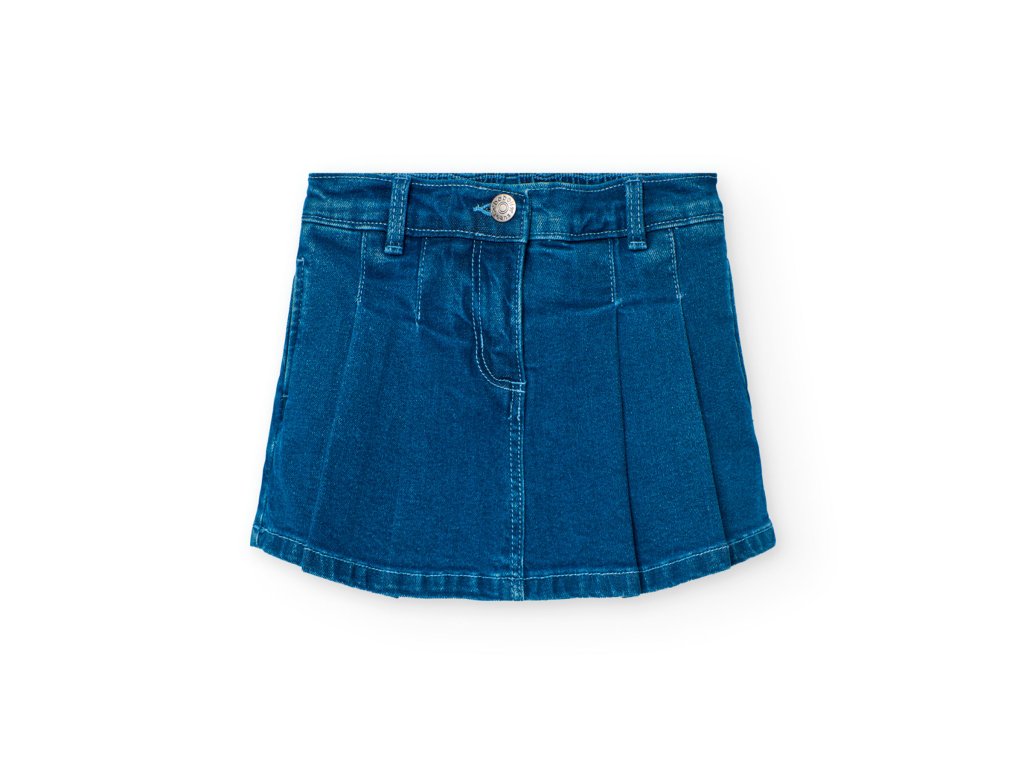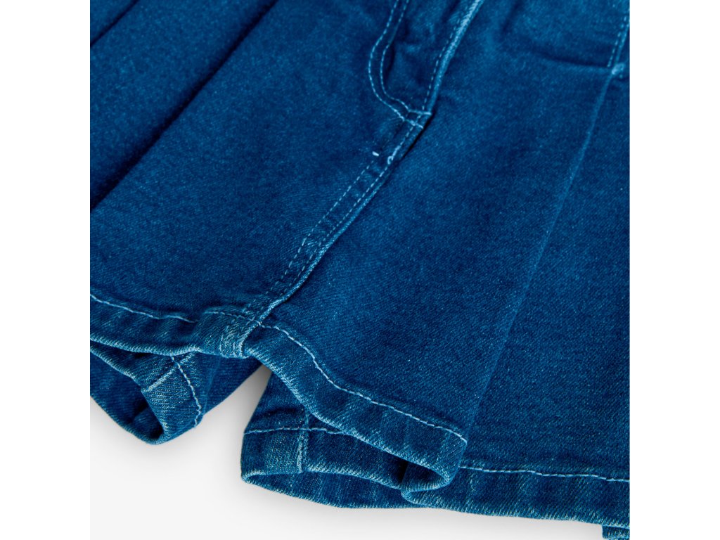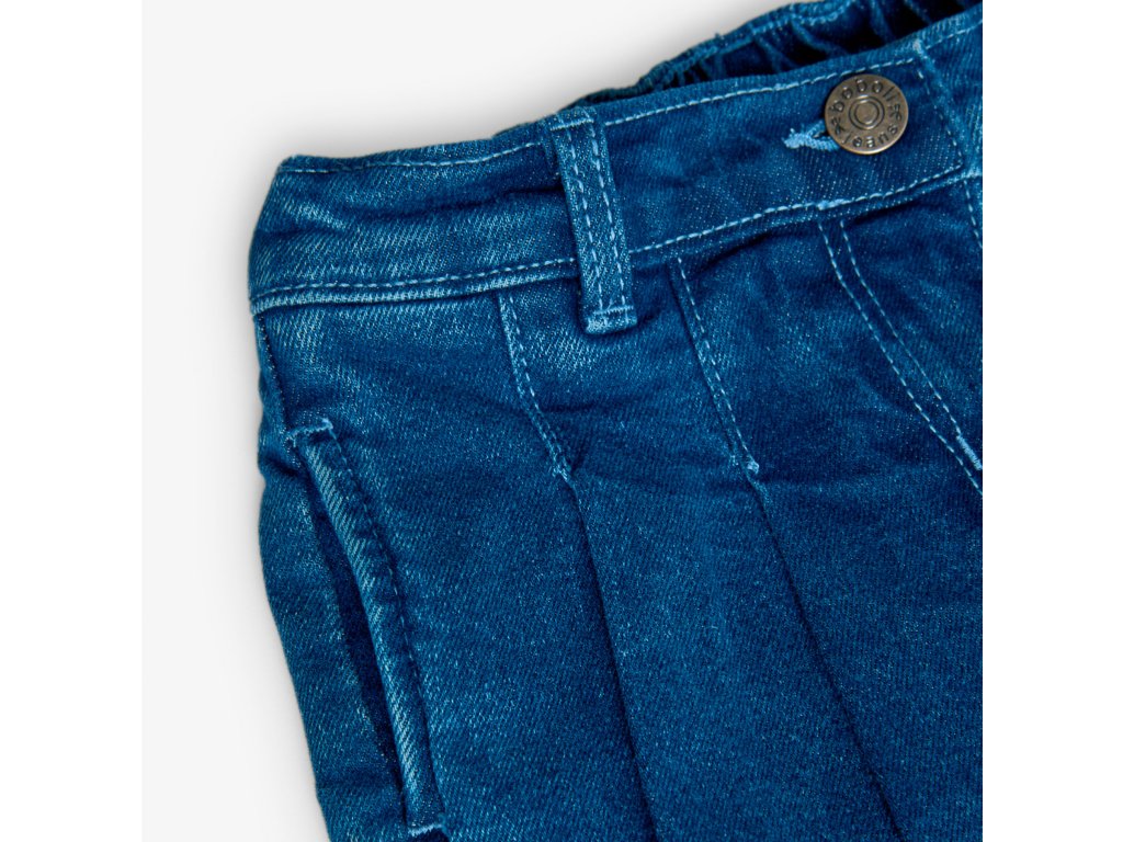 Novinka od Boboli, džínová sukně - kraťasy v jednom. Vpředu skládaná sukně, vzadu kraťasy. Skvělá kombinace pro každodenní nošení vaší slečny. Zapínání na knoflík a zip. Uvnitř regulace pasu, všitá široká guma. Vpředu dvě kapsy. Doporučujeme kombinovat s tričkem z nabídky ze stejné kolekce. Vytvoříte tak pro svou slečnu jedinečný outfit.